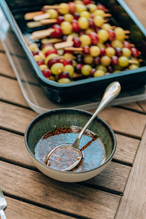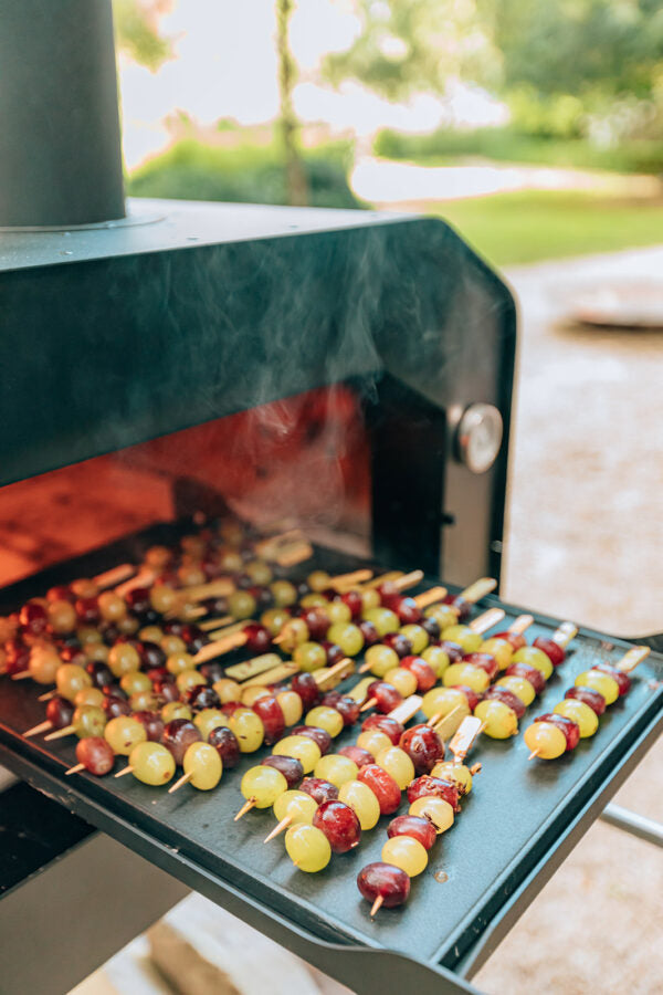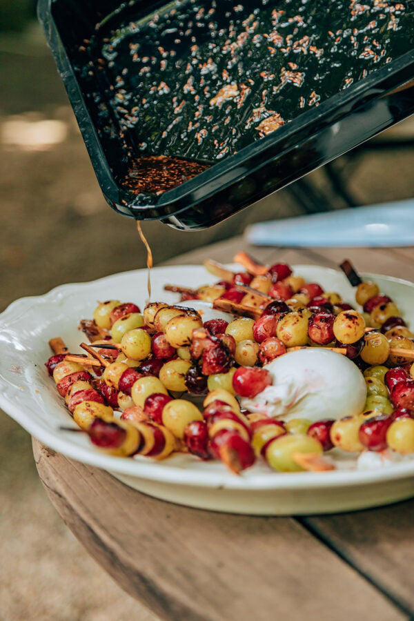 This recipe is inspired by a recipe by the popular chef Ottolenghi. The recipe has been adapted for the wood oven. Thanks to the wood aroma, the sweet notes of the grilled grapes come into their own even more. The marinade with fennel seed creates a wonderfully oriental atmosphere.